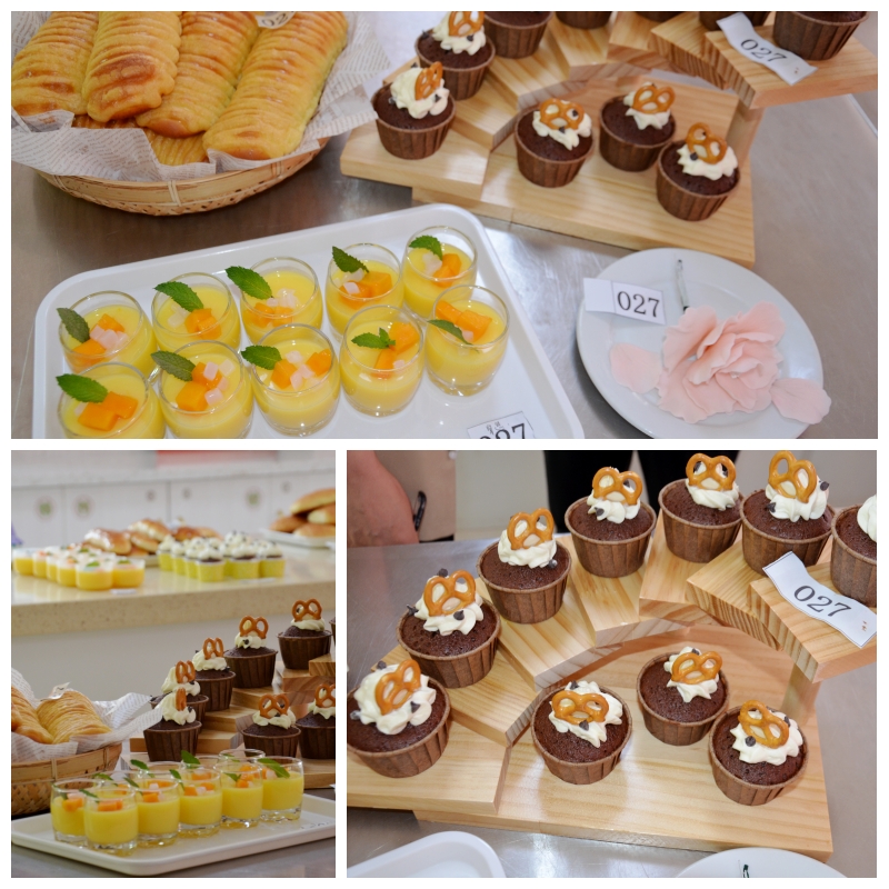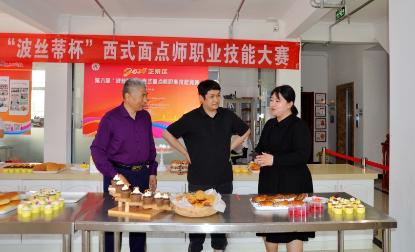 烟台市芝罘区人社局职建科负责人李楠(右一)、波丝蒂培训学校副校长陈聪(中)、烟台面点大师王惠忠(左一)在竞赛现场